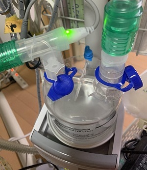 呼吸器回路の呼気弁をふさがない様にペットボトルを切って使用しています。切ったところは鋭利にならないよう紙やすりで丸くしています。